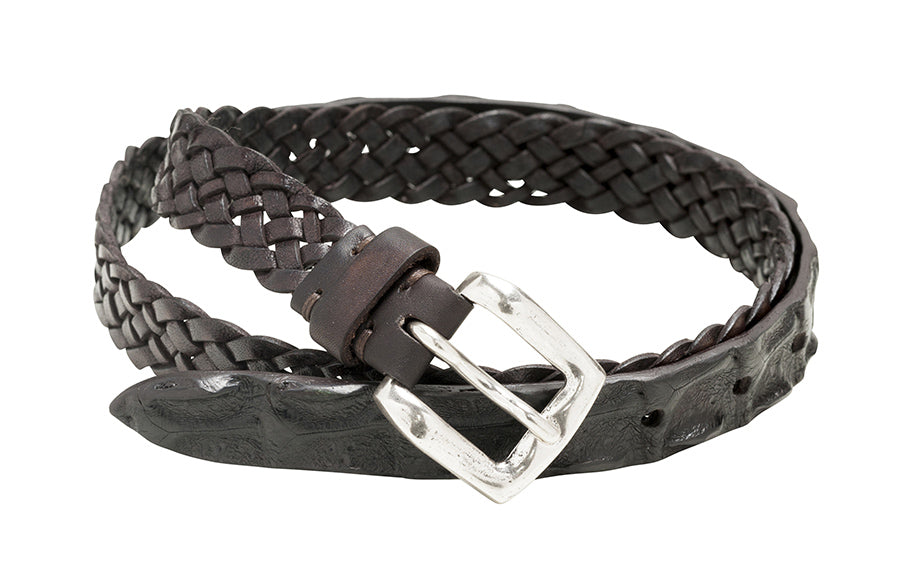 HAND-WOVEN LEATHER BELT WITH CROCODILE LEATHER TRIM. AGED SILVER BUCKLE.