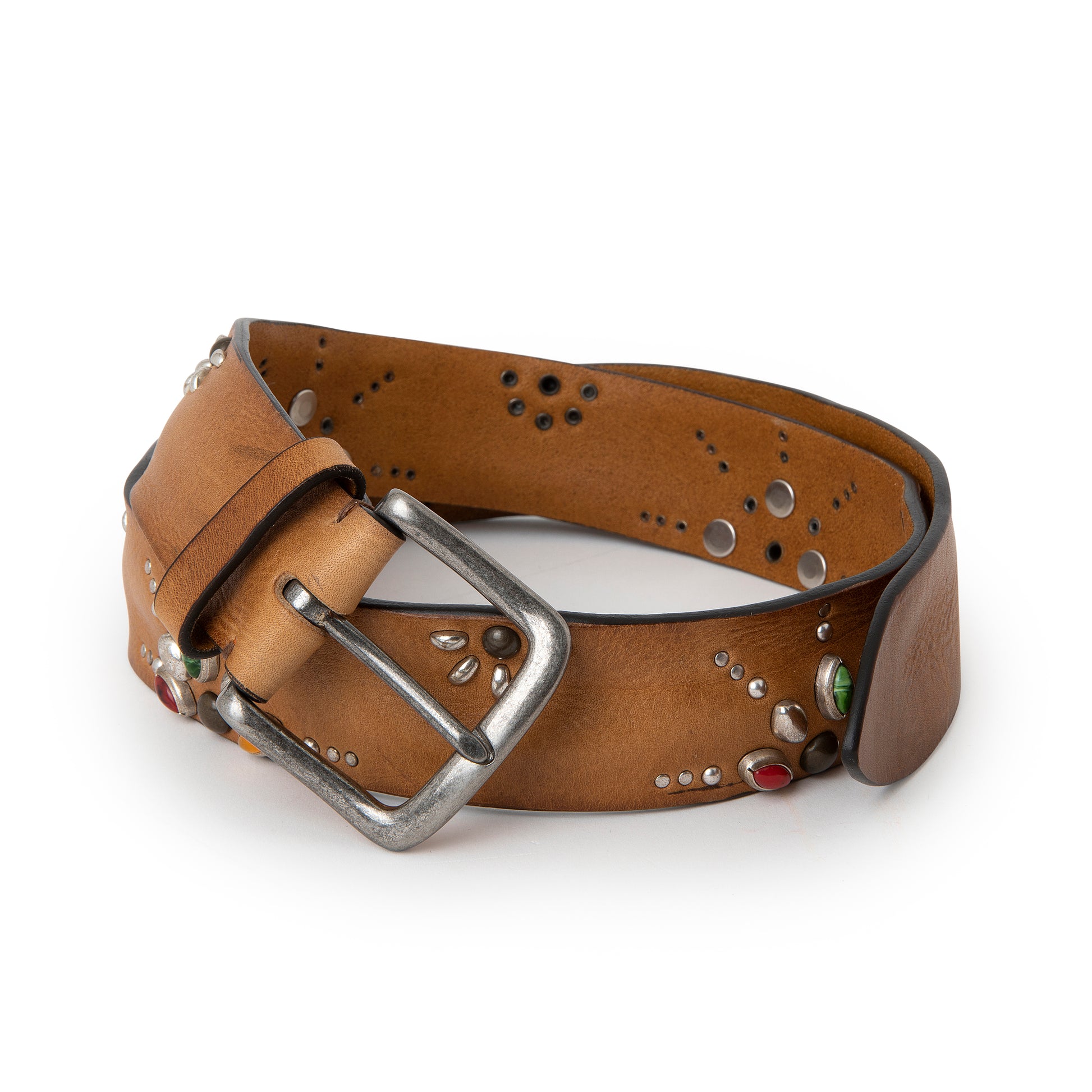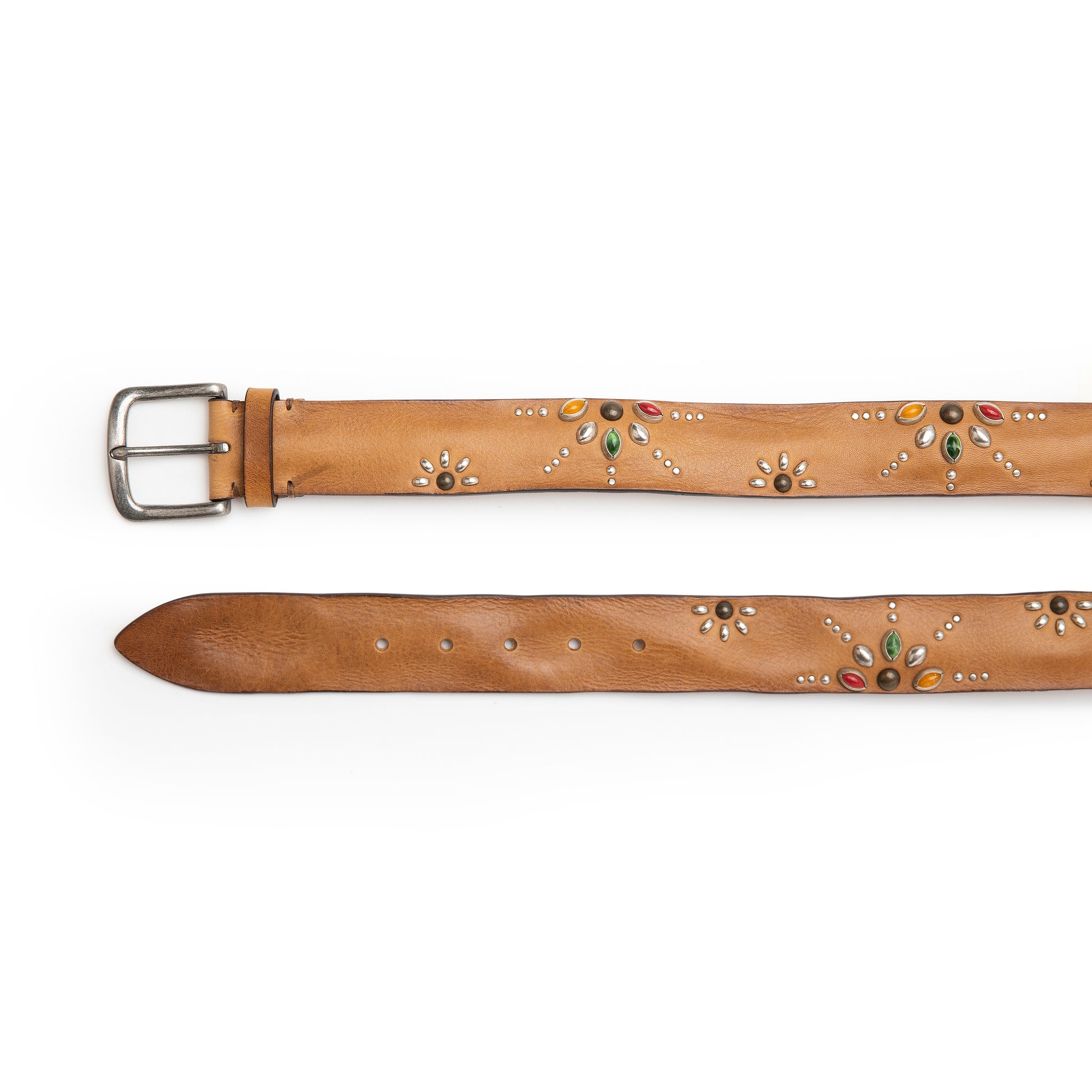 LANCASTER LEATHER BELT WITH STUDS IN FLOWER AND SUN MOTIFS.