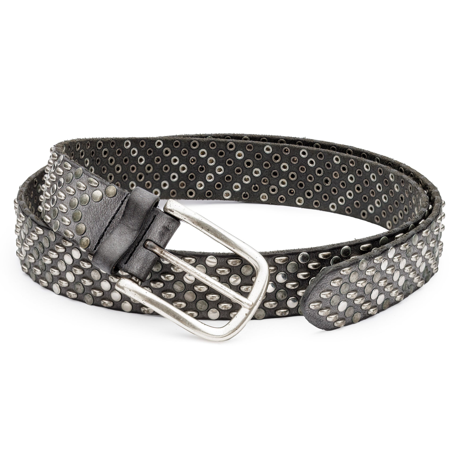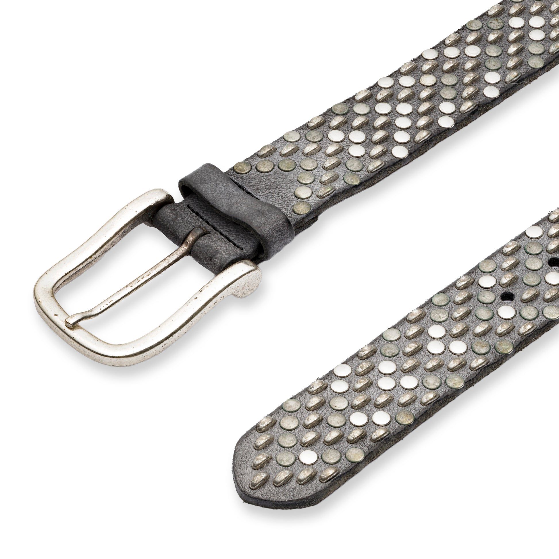 WASHED LEATHER BELT WITH MANY GREY STUDS.