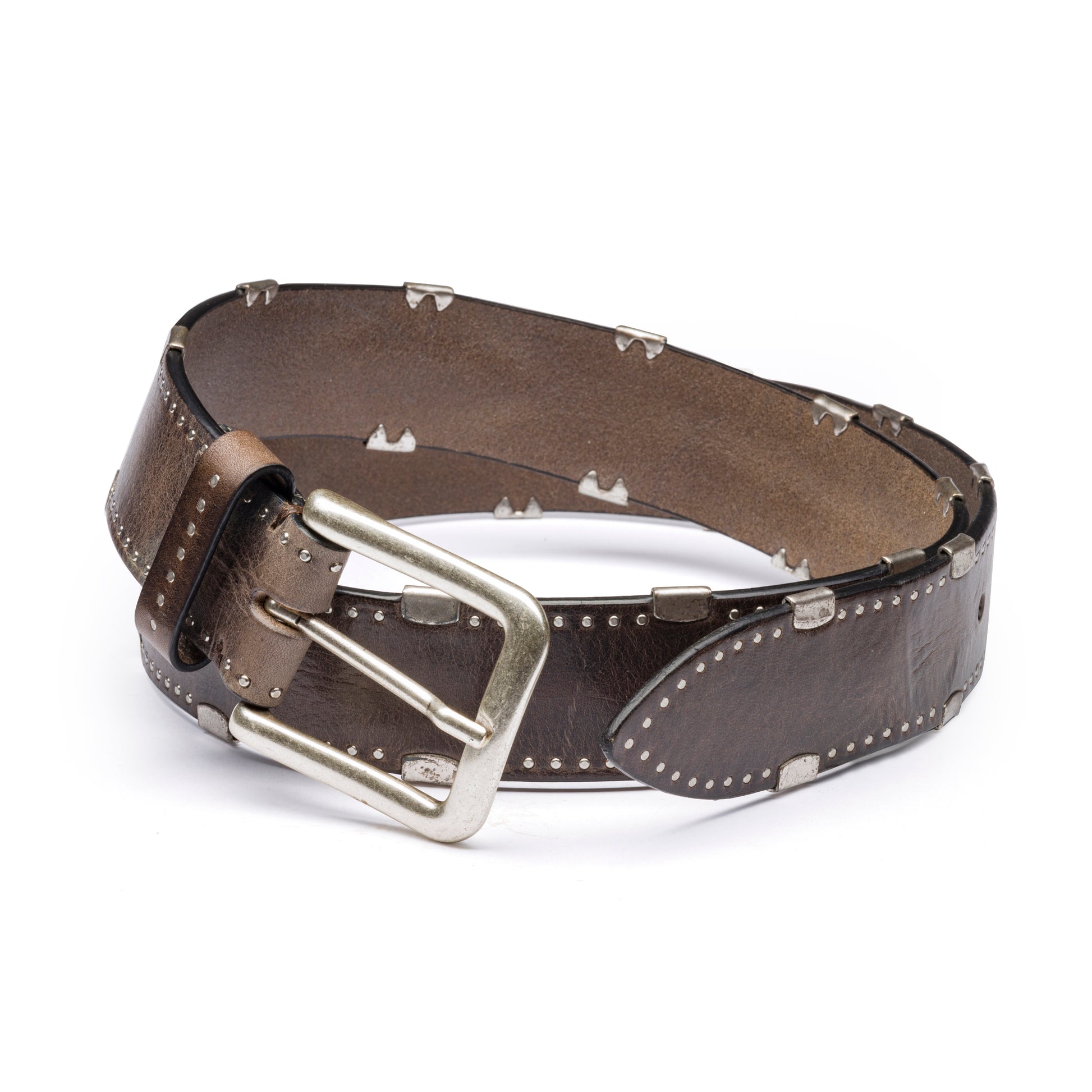 WASHED DOUGLAS COGNAC LEATHER BELTS WITH STUDS AND MATT SILVER BUCKLE.