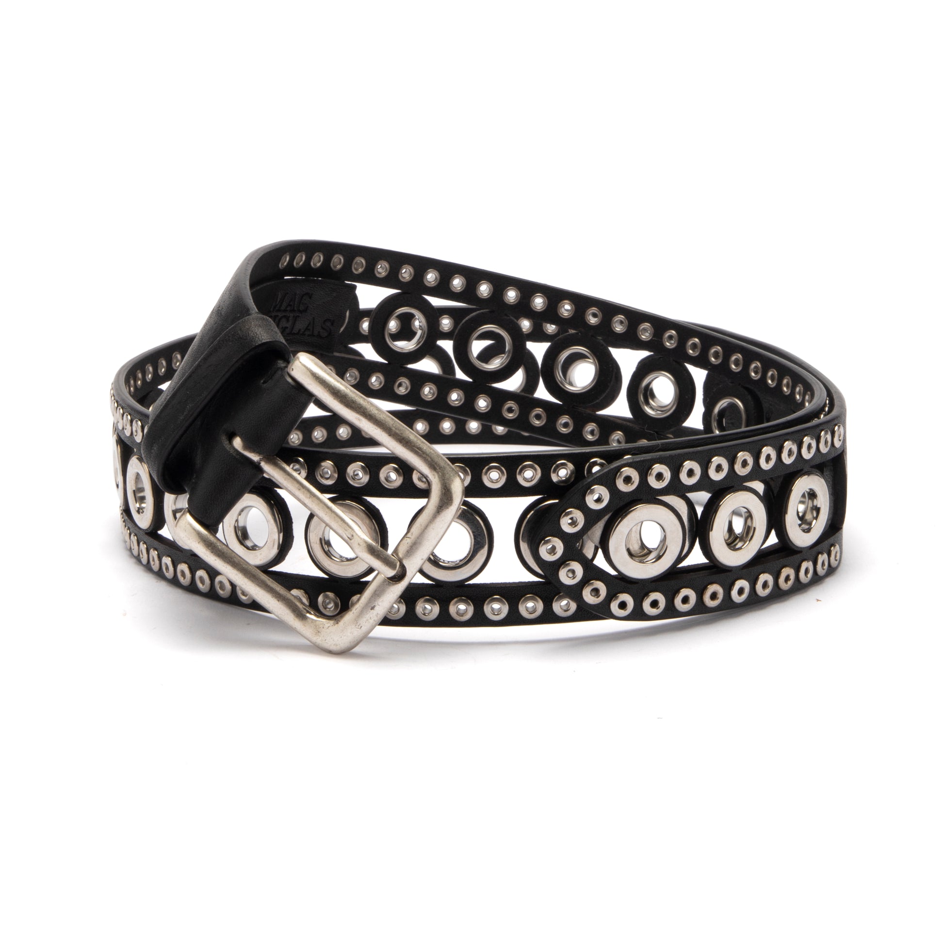 VINTAGE LEATHER BELT WITH ROUND STUDS AND SILVER BUCKLE.