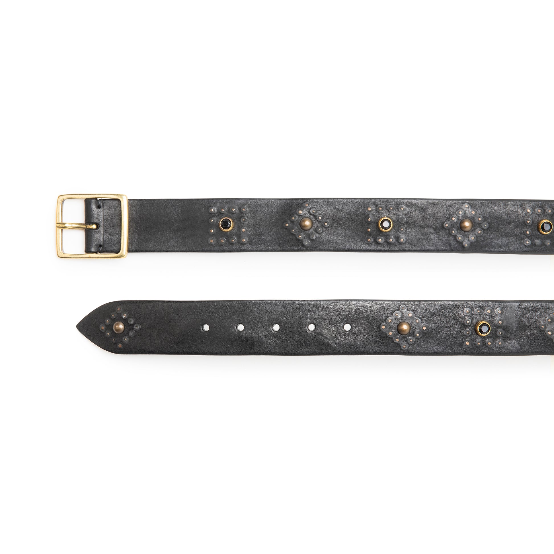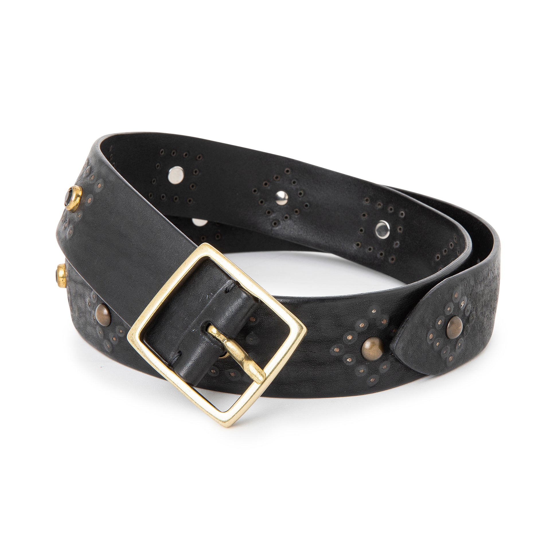 VINTAGE LEATHER BELTS WITH SMALLER STUDS AND GOLDEN BUCKLE.