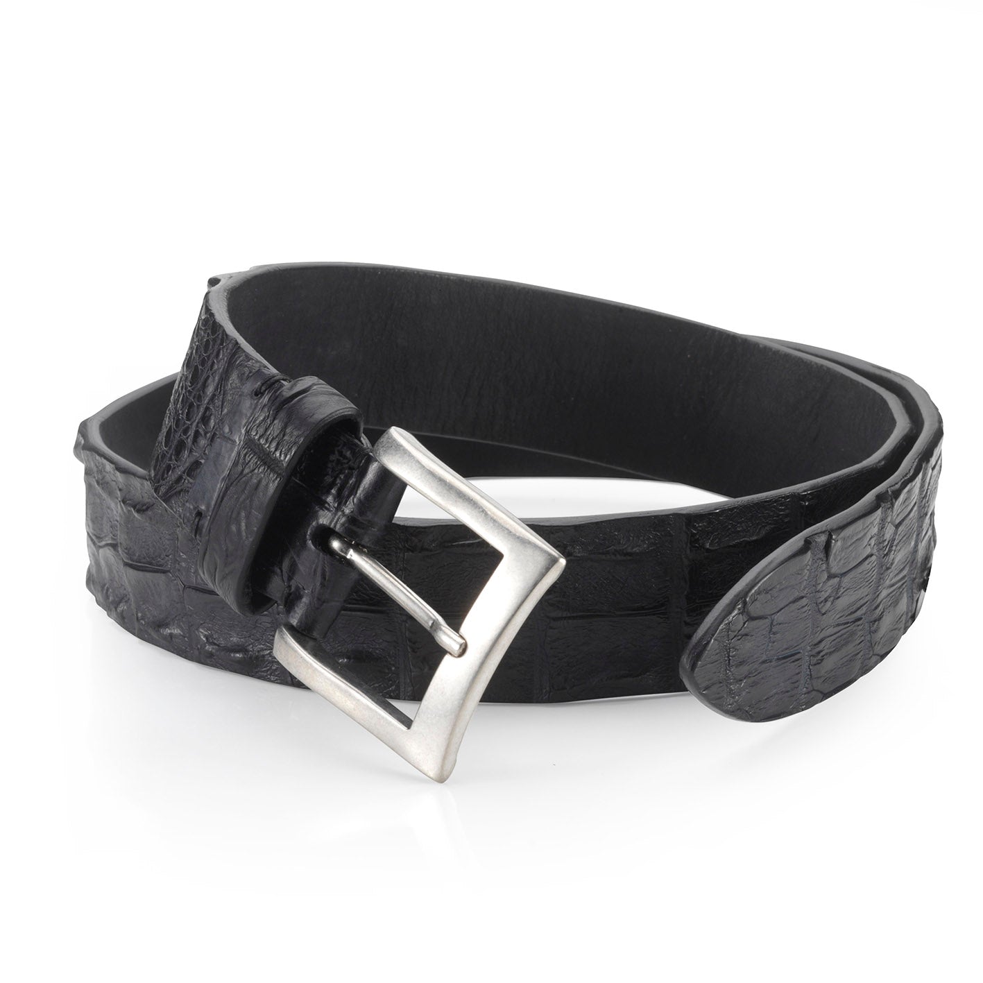 HAND-DYED AND WAXED CROCODILE LEATHER BELT WITH SILVER-PLATED BRASS BUCKLE.