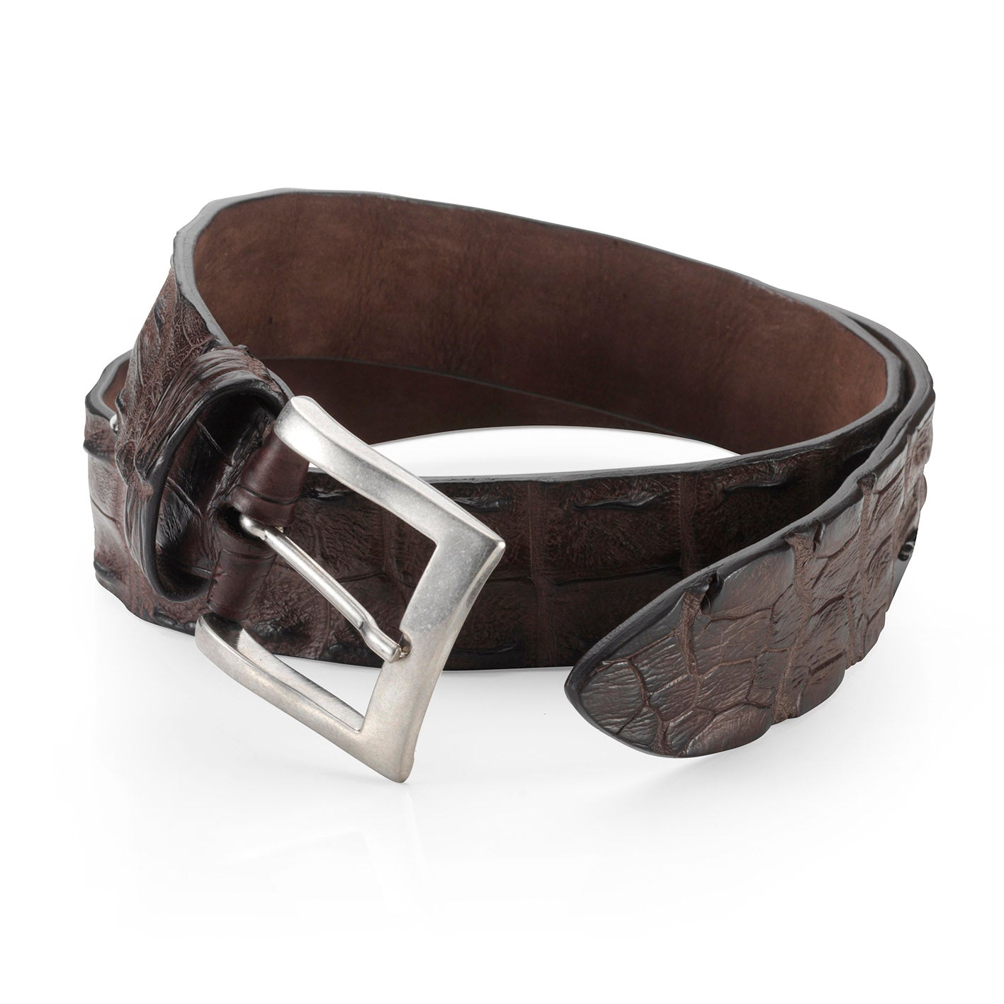 HAND-DYED AND WAXED CROCODILE LEATHER BELT WITH SILVER-PLATED BRASS BUCKLE.