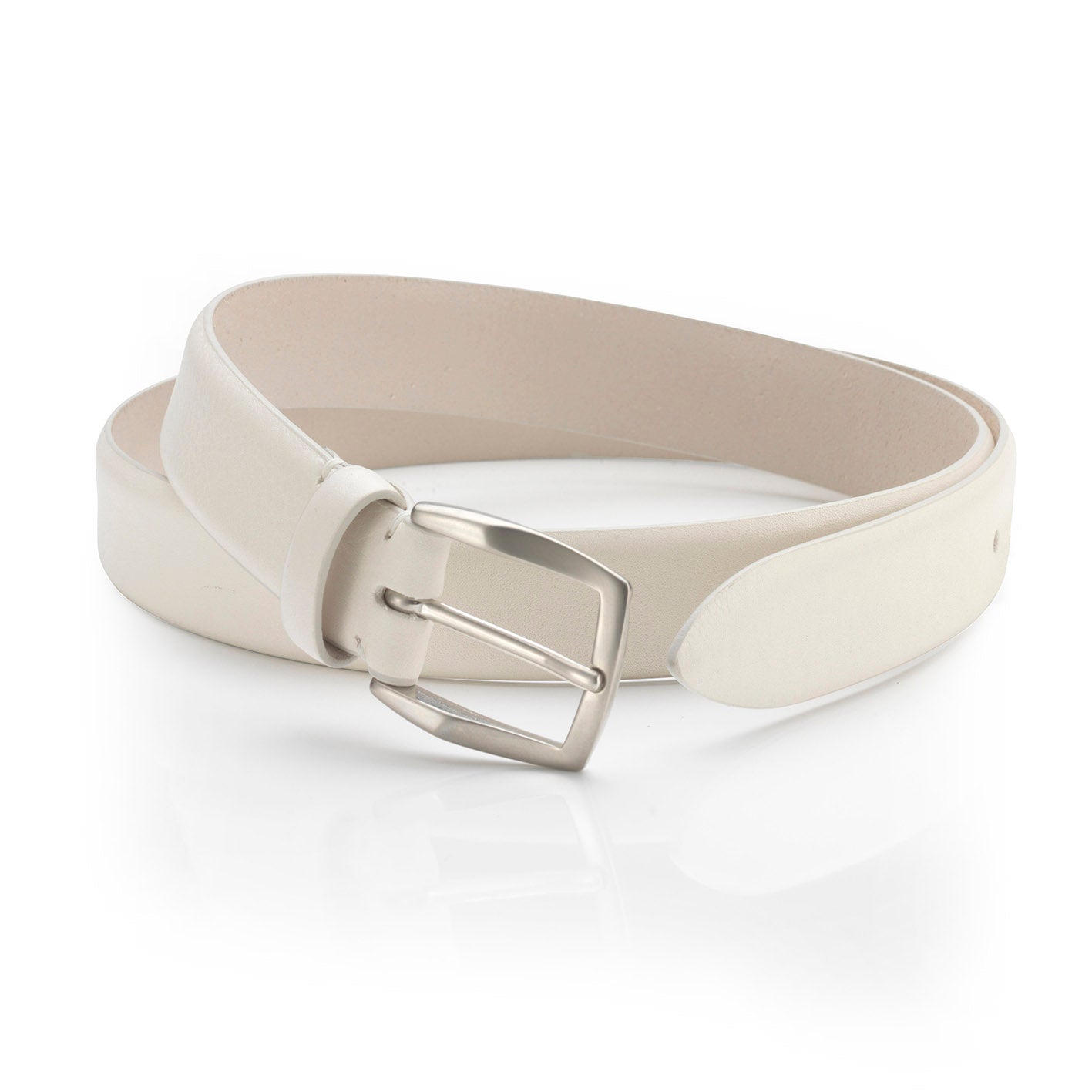 CURVED LEATHER BELT, BRUSHED NICKEL BRASS BUCKLE.