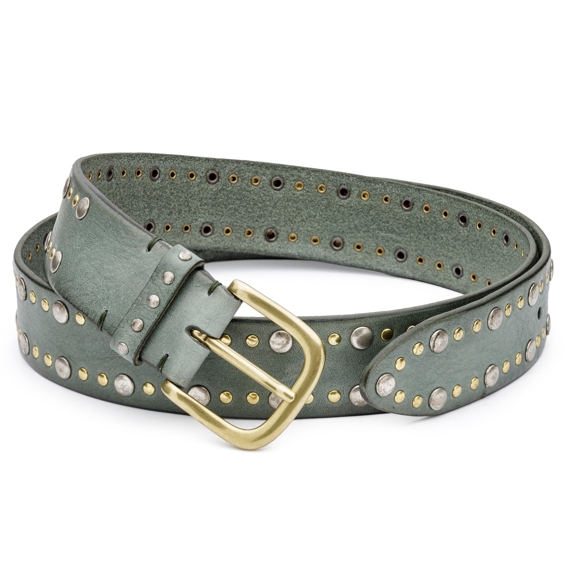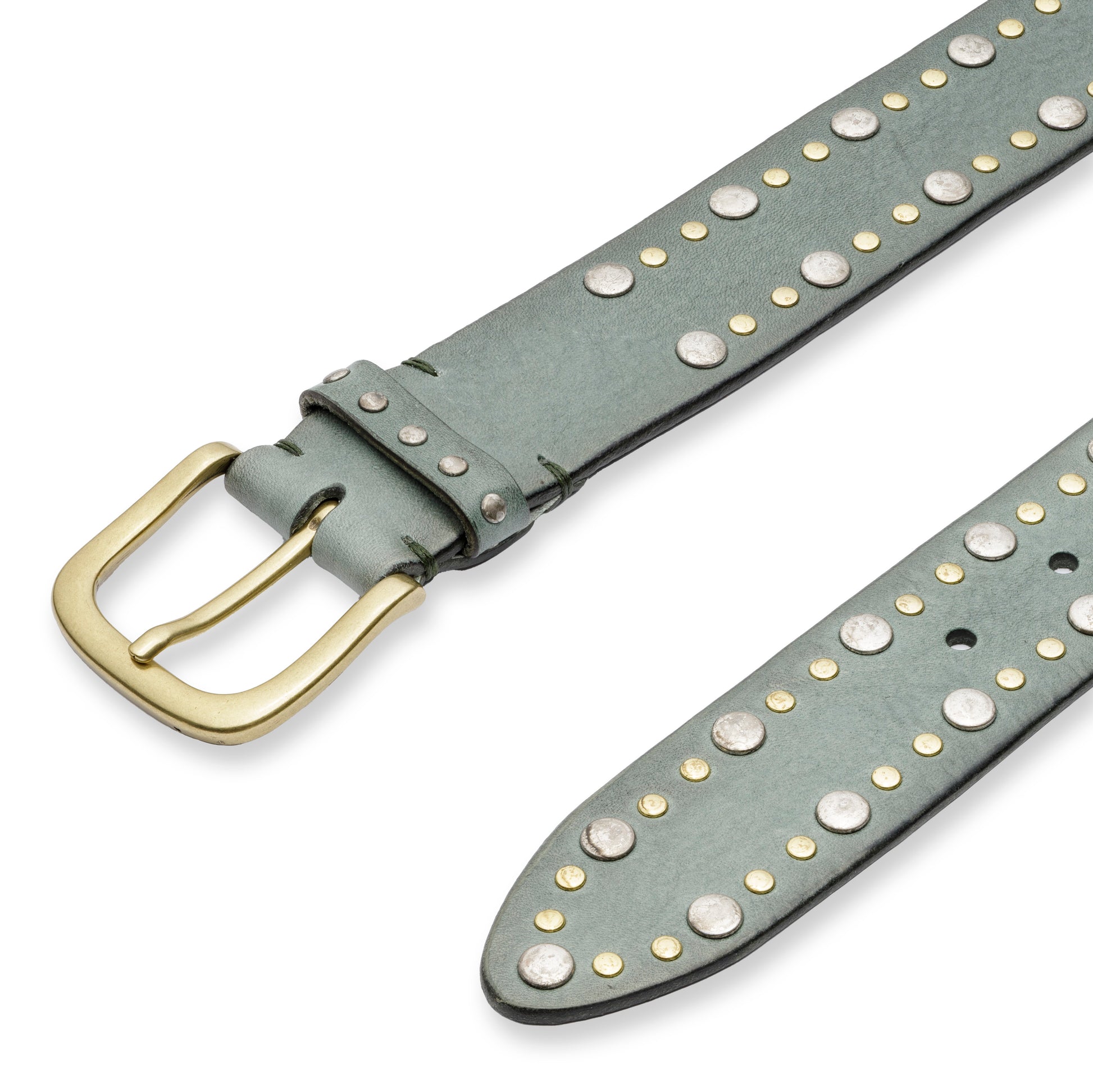 LEATHER BELT WITH ROUND STUDS AND BRONZE BUCKLE.