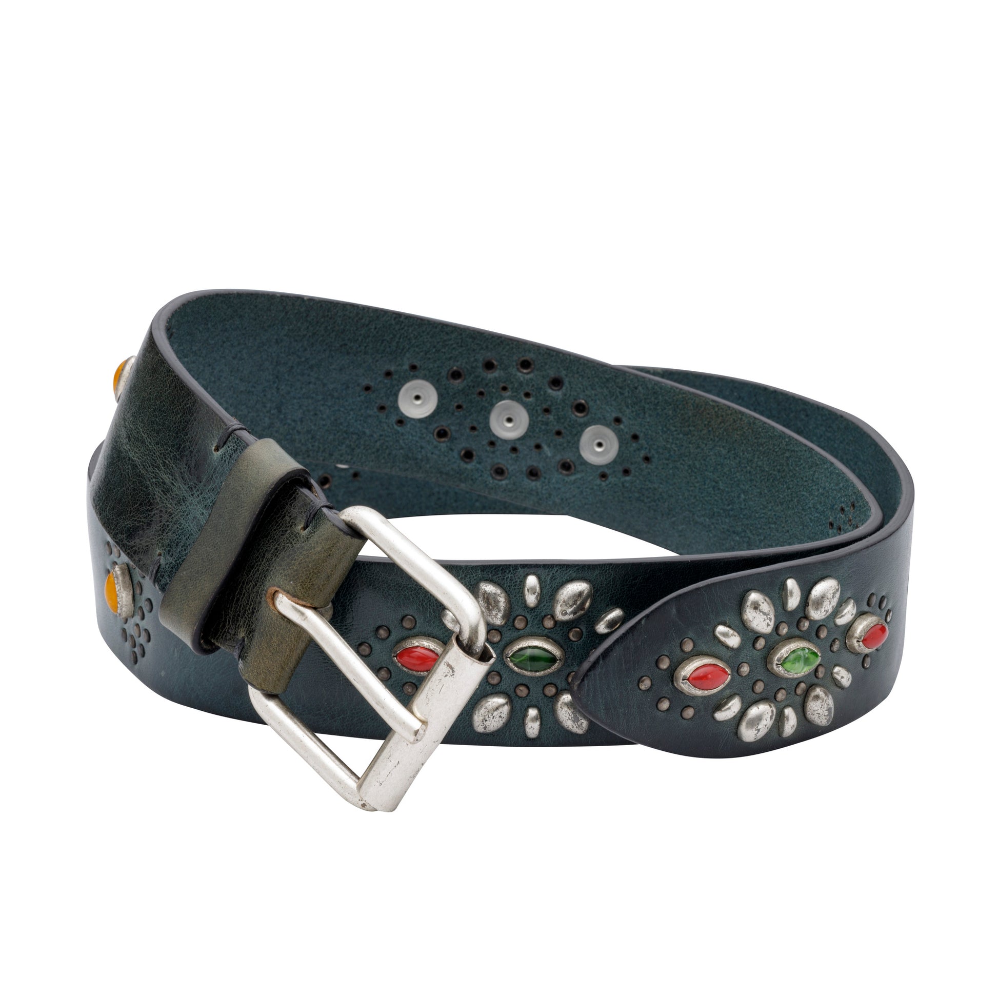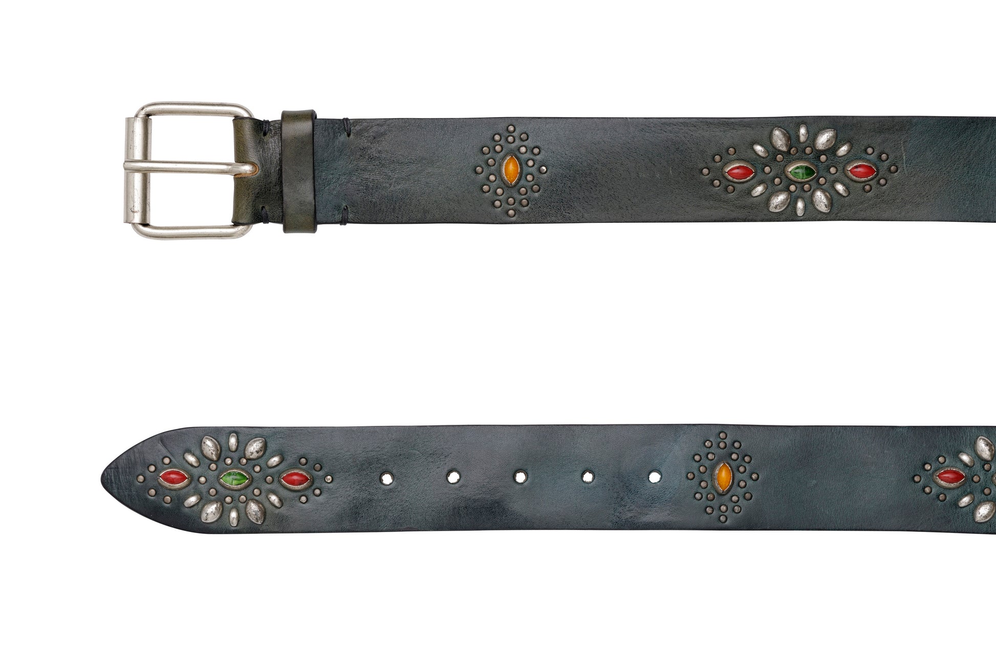 VINTAGE LEATHER BELTS WITH STUDS AND SILVER BUCKLE.