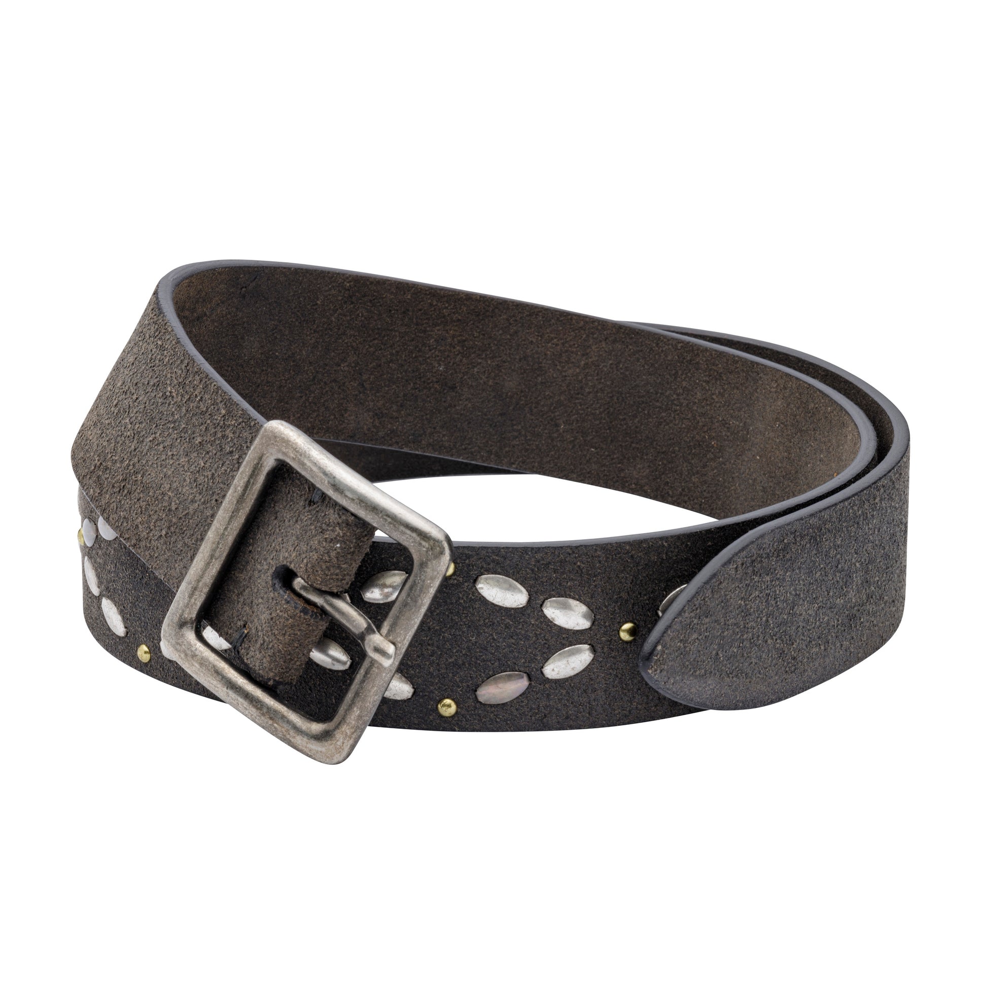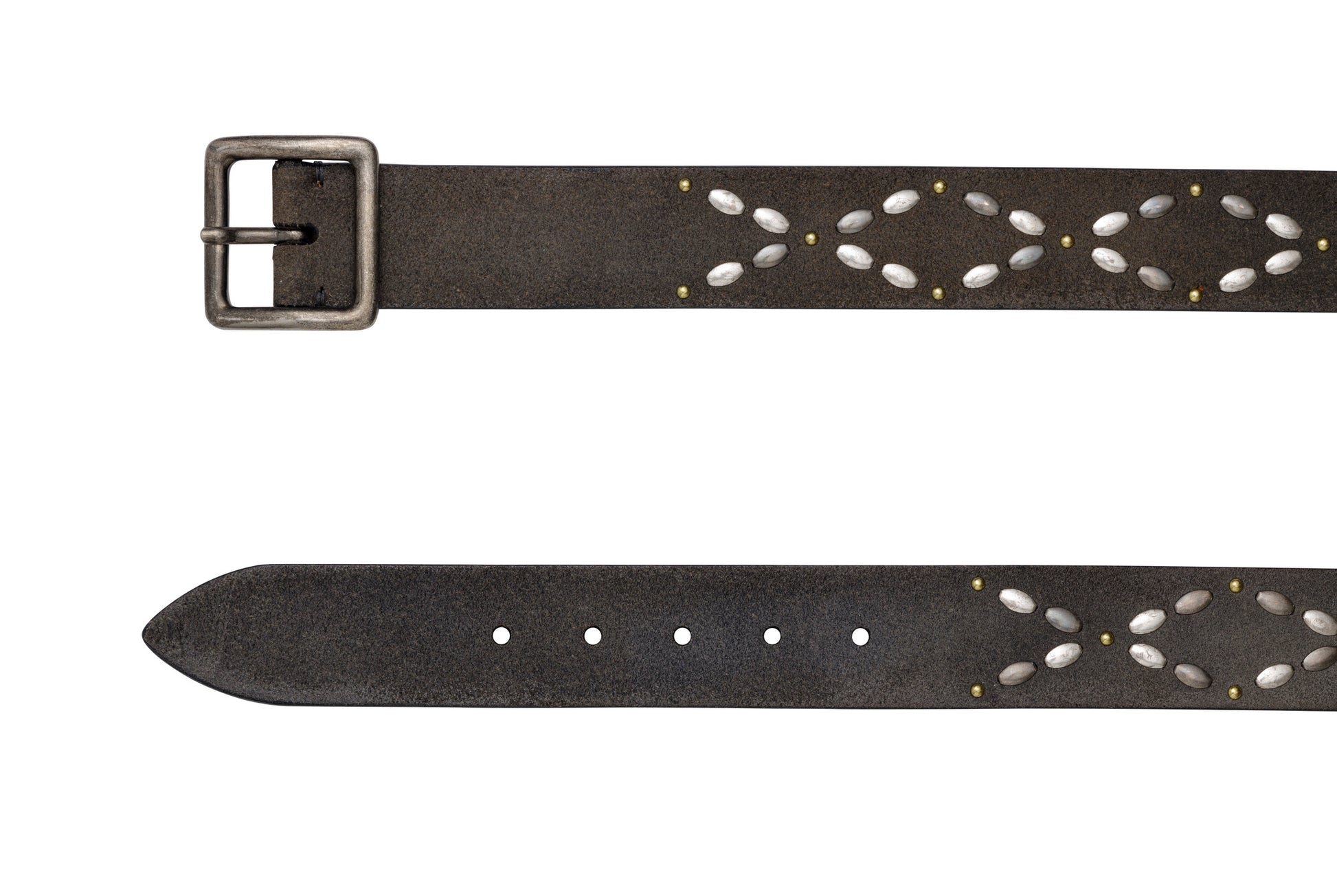 CRUST LEATHER BELTS WITH STUDS AND ENGLISH SILVER BUCKLE.
