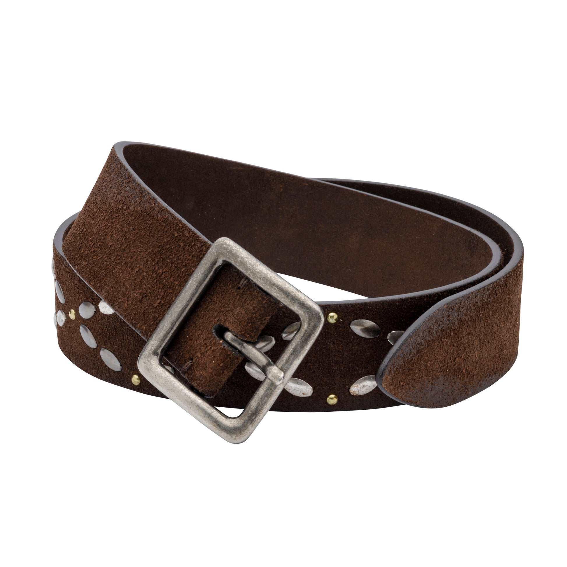 CRUST LEATHER BELTS WITH STUDS AND ENGLISH SILVER BUCKLE.